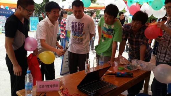 在本届心博会中,学院心理气象分站在展区内设计了“趣味钓鱼”的小游戏和心理测试的互动。心理气象员积极鼓励广大同学参与到心理健康知识宣传的互动当中,同学们的参与热情也十分高涨。“钓鱼游戏”为心理气象员自主设计,利用手边的玻璃瓶、雨伞、树枝和透明胶进行布置,参与者要将挂在雨伞上的短于玻璃瓶直径的小树枝伸入瓶中,并将瓶子吊起来放入15cm之外的透明胶带中。游戏集趣味性和挑战性于一身,吸引了很多同学前来挑战,现场气氛十分热烈,准备好的糖果等小奖品也陆续被送出。