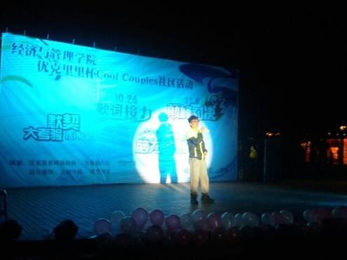 10月26日,由经管公寓社区2012级主办的Cool Couples大赛进行了一轮重要的比拼——歌词接力赛。本次比赛由经济与管理学院夏雨乔、谢新宇主持,由南航“十佳歌手”李杭和“经管好声音”优秀选手刘入嘉、马菱苓领唱。
