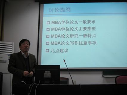 研讨会上,经管院副院长张卓教授就MBA学位论文指导工作与大家分享了自己的经验。他从MBA学位论文的要求、类型、特点和注意事项等方面进行了论述。强调MBA专业学位论文更应该结合工作实际,论文选题要仔细斟酌,要符合工商管理专业培养目标。最后,张教授就论文指导工作给出了四点建议:严格要求、结合实际、保证时间、勤于指导。
