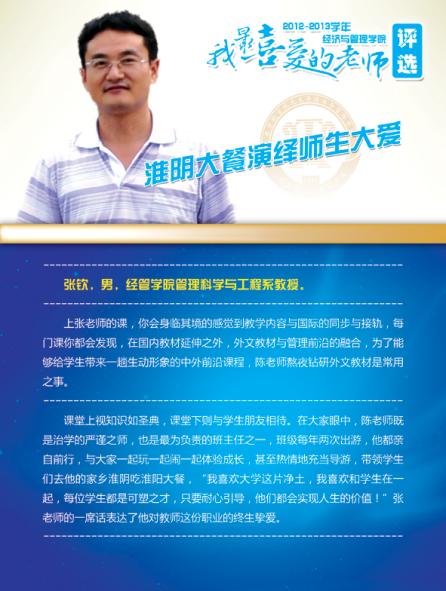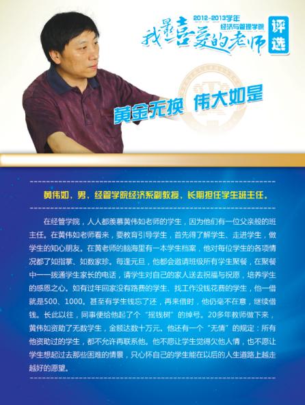 通过学院各系部及学生推荐评选,学院涌现出了一批深受学生喜爱的优秀教师,这些老师当中有认真做学问踏实上讲台的青年骨干,有实践式教学案例式授课的专业学者,有把程序写进生活的幽默大师,有竞赛场上意气风发的指导名师,有默默无言资助无数学生的“摇钱树”,有用文学演绎经济学之大美的系部中流砥柱,有指导学生自主式成功创业的帮帮老师,让我们走进这些老师,品读他们的感人事迹!