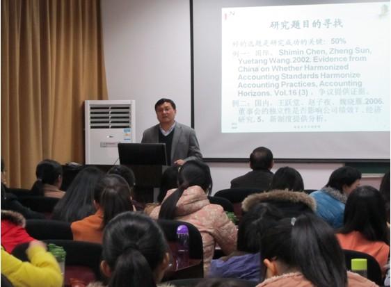 12月10日下午,教育部长江学者特聘教授、南京大学管理学院副院长、江苏省审计学会副会长、中国实证会计研究会常务理事王跃堂教授,在南京航空航天大学将军路校区经济与管理学院大楼704室为我院师生作了题为“实证会计研究的若干问题”的学术报告。报告会由经管院“财务与会计研究所”主办,研究所所长耿成轩教授主持,刘益平教授等我院相关学科专业的老师、研究生和本科生参加并聆听了学术报告。