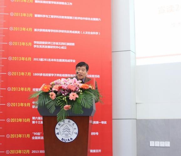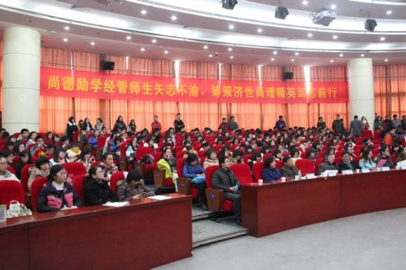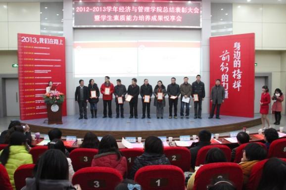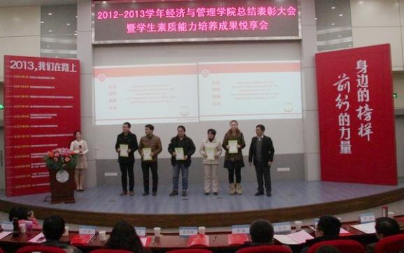 为立体地展现学院优秀学子精勤求学、教师勤勉育人的风貌,分享学生一年来素质能力培养成果,凸显学院全体师生“尚德励学 筹策济世”的风尚,经管学院2012-2013学年“御商•致远”总结表彰大会暨学生素质能力培养成果悦享会于12月20日下午隆重召开。教务处副处长金科、校团委副书记王霄、研究生院教育管理处副处长管祎、学生处事务科科长张跃、经管院院长周德群、党委书记李遥、副院长张卓、党委副书记许静、学院办公室主任、团委书记、企业导师代表、本科生导师代表、班主任代表、辅导员以及四百多名经管学生参加,大会由工商管理系谢嗣胜老师和2012级本科生樊佳慧主持。