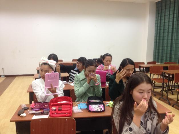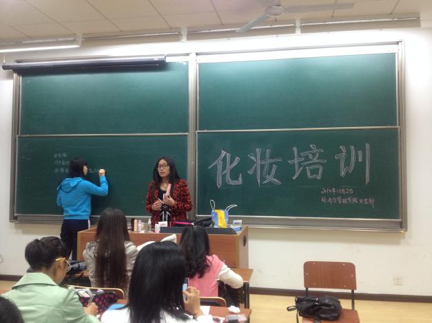 “小山重叠金明灭,鬓云欲度香腮雪。”原大使团核心成员汪婷在培训伊始抛砖引玉,为大家讲述了化妆的主要步骤,细心的解说、详尽的介绍,大家耐心地听讲,时而提问时而认真记笔记,十分专注。为了让在场女生更加了解化妆的奥妙,汪婷学姐亲自上阵,为其中一位女生化了一个美美的妆,并以此为例为大家讲解化妆的注意点。培训学员也现场实践,“云髻峨峨,修眉联娟”,从修眉到涂粉底,从眼线到唇线,从打底到定妆,大家一步步学习,“双眉有如柳叶刀裁,盈盈笑意眉上来”,经过细心描绘,一张张美丽妆容展现。