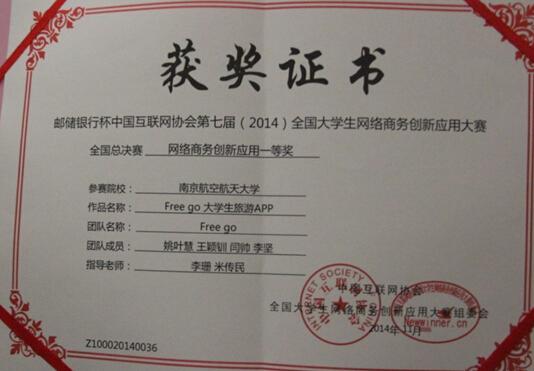 2014年12月1日,邮储银行杯第七届全国大学生网络商务创新应用大赛总决赛在北京邮电大学隆重举行。我校经济与管理学院信息管理与信息系统专业学生姚叶慧、王颖钏、闫帅和电子商务专业学生李坚同学组成的“Free Go”团队获得总决赛一等奖。