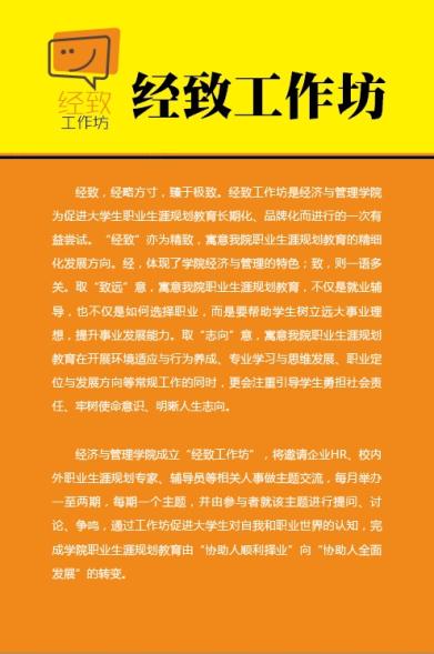 经致,经略方寸,臻于极致。经致工作坊是经济与管理学院为促进大学生职业生涯规划教育长期化、品牌化而进行的一次有益尝试,工作坊将邀请企业HR、校内外职业生涯规划专家、辅导员等相关人事做主题交流,每月举办一至两期,每期一个主题,并由参与者就该主题进行提问、讨论、争鸣,通过工作坊促进大学生对自我和职业世界的认知,完成学院职业生涯规划教育由“协助人顺利择业”向“协助人全面发展”的转变。