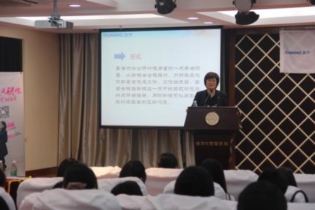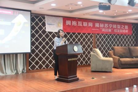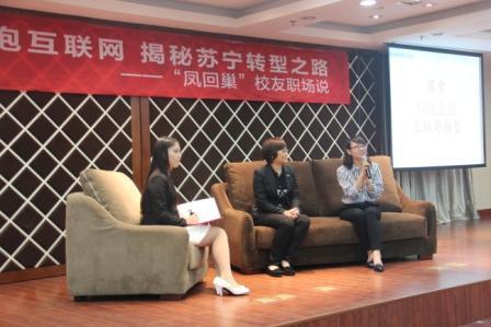 4月28号晚,经济与管理学院携手苏宁云商集团举办了“凤回巢”校友职场说活动,本次活动由校就业指导服务中心主办,经济与管理学院承办,苏宁企业俱乐部协办。苏宁云商南京大区副总经理邹冬萍、都艳艳,人力资源中心张雯莉,校就业指导服务中心主任徐俊珠,校就业指导服务中心主任指导部部长沈雪萍,经管院党委副书记许静,苏宁企业俱乐部指导老师庞依达,以及苏宁企业俱乐部成员、经管院学生代表等100余人参加了此次活动。