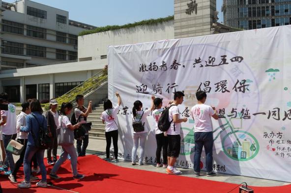 上午十点,南航志愿者与骑行大军一起从江宁出发,身着贴有“迎五四、倡环保”标语的白色T恤,路漫漫,爨蒸蒸,十余里,千百转,人不畏,一路骑行,一路宣传环保理念,引来无数路人的回头与观望,十一点半,志愿者们顺利到达目的地南理工。随后,各校骑行活动负责人对活动进行了经验总结,志愿者也分享了所行所想,并在宣传展画上签名表达对环保的美好祝愿。