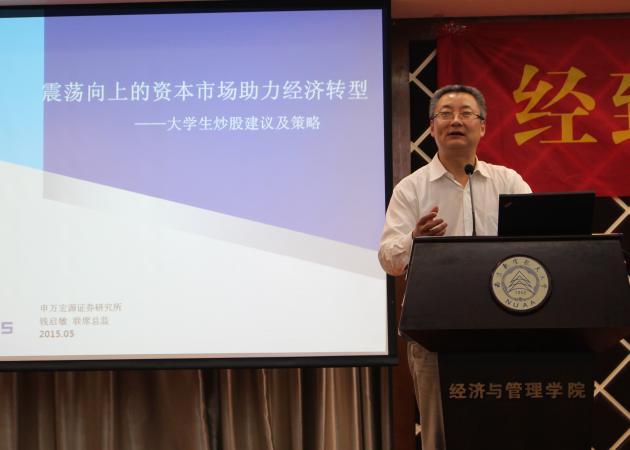 5月15日下午,由校党委研工部、校团委、经济与管理学院、金融研究所主办,校研究生会、经济与管理学院研究生会承办的“股市直通车——大学生炒股利弊与策略分析”学术沙龙在南京航空航天大学将军路校区经济与管理学院A0305报告厅成功举办。本次沙龙特别邀请了申万宏源证券研究所市场研究部副经理钱启敏、申万宏源证券南京华侨路营业部总经理王苏龙、南京百众投资管理有限公司总经理陈力以及经管学院党委书记焦宏图老师、段进东老师、徐强老师和党委研工部张廷赟老师作为嘉宾与同学们共同探讨大学生炒股利弊、股市行情和炒股策略等方面的内容。