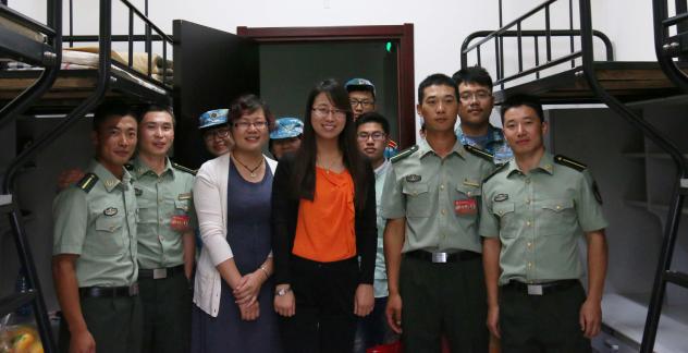9月15日,学院党委副书记许静老师在2015级辅导员田苑娜、新生班级学导以及新生代表的陪同下,慰问了承担本次军训任务的教官。