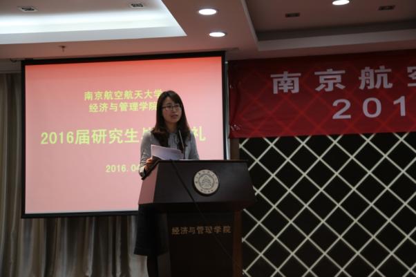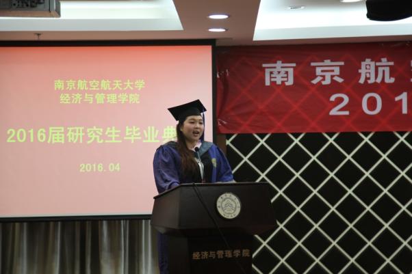 4月1日下午,经济与管理学院在将军路校区学院报告厅举行2016届研究生毕业典礼。学院领导、专业老师代表、2016届研究生和家长代表出席了典礼。