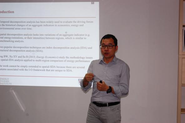 4月12日上午十点,新加坡国立大学能源研究所高级研究员、能源系统建模团队负责人苏斌来我院交流。苏斌研究员主要研究能源和环境经济与政策、能源与气候变化、能源环境系统建模和分析,在能源和环境相关的国际期刊上已发表近30多篇文章。这次他为能源软科学研究中心的师生们带来了他的最新研究成果——Multi-region comparison of emission performance: The structural decomposition analysis approach。