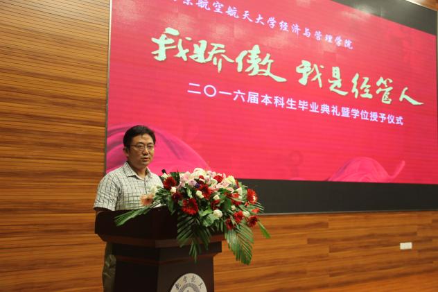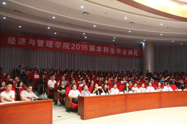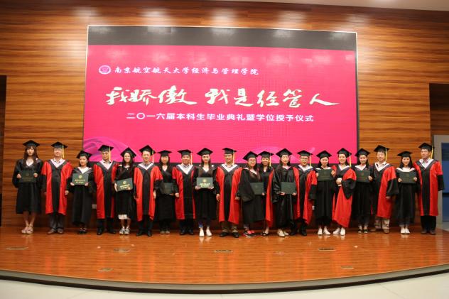 6月20日晚,“我骄傲,我是经管人”经济与管理学院2016届本科生毕业典礼暨学位授予仪式在将军路校区一号楼报告厅举行。经管学院党委书记焦宏图,院长周德群,教务处副处长朱建军,学院副院长张卓、王英、周鹏,党委副书记许静,管理科学与工程系主任马静,工商管理系主任王子龙,经济系主任邓晶,教师代表、院友代表、家长代表和全体毕业生出席了典礼。
