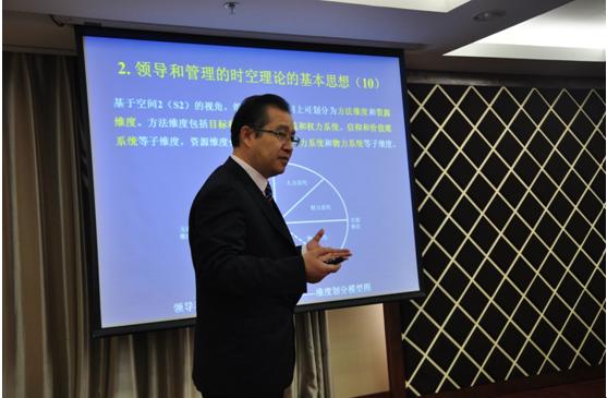接下来,论坛进入主题报告阶段。上半场的学术报告由南京航空航天大学经济与管理学院胡恩华教授主持。首先是来自清华大学经济管理学院陈国权教授带来了一场题为“领导和管理的时空理论”的学术报告。陈教授为了引入时空观念,将组织比喻成为一个时空系统,即任何组织都是一个时空的体系,包含时间和空间的因素。基于这个比喻,陈教授提出,领导者和管理者要从时空的视角来分析一个组织,要从“time”和“space”两个维度来同时分析和设计组织,领导者和管理者只有具有时空的思维,同时从动态和系统的角度来开展工作,才能够成功地领导和管理一个组织。在演讲的过程中,陈教授给出了几张象形文字图片,从时间和空间维度上来解析领导和管理的时空理论,并自己绘制的一幅画展示了他的领导和管理的时空理论,可谓是别出心裁,让人耳目一新。