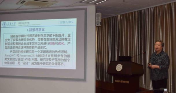 茶歇结束后,天津大学杜纲教授进行了题为“面向产品族设计的主从关联优化”的报告。杜纲教授现任天津大学管理与经济学部教授,管理科学与工程博士生导师。曾担任中国运筹学会常务理事、天津市运筹学会理事长及运筹与管理编委等。主要研究领域为管理系统分析与决策、系统工程与系统优化、工业工程、产品研发管理与供应链管理等。