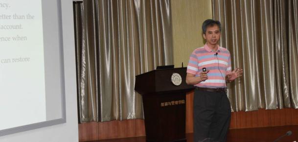 紧接着,清华大学陈剑教授以“Dynamic production planning with two production modes, switching costs, and carbon price volatility”为题进行了报告。陈剑教授现任清华大学经济与管理学院联想讲席教授、教育部长江特聘教授、管理科学与工程系主任。担任中国信息协会常务理事长、中国系统工程学会副理事长、中国优选法统筹法与经济数学研究会副理事以及IEEE系统、人与控制论学会服务系统与组织专业委员会主任。他的研究领域主要有供应链管理、电子商务、服务运营、商务智能、决策分析、企业信息化等。