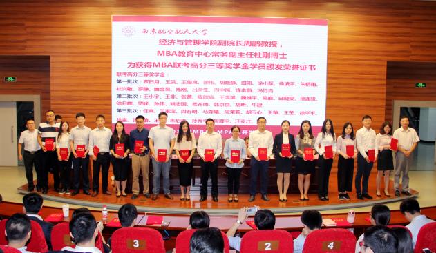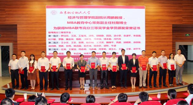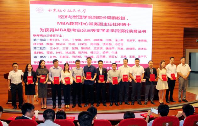 随后,经济与管理学院党委焦宏图书记宣读获得2017年MBA奖学金名单,本次奖学金项目分为名次奖学金和高分奖学金。研究生院常务副院长江驹教授、经济与管理学院院长周德群教授、经济与管理学院党委焦宏图书记、经济与管理学院副院长周鹏教授、经济与管理学院教育培训中心(MBA、MPAcc教育中心)执行主任杜刚博士分别为获得奖学金的学生颁发证书并合影留念。