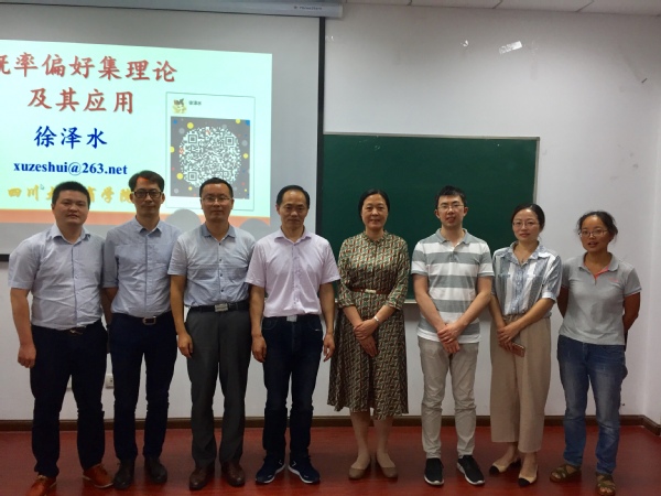 2018年09月29号下午,四川大学商学院徐泽水教授受我院智能决策与风险分析研究所邀请,在经管院704室做了题为“概率偏好决策理论方法与应用”的精彩讲座。经济与管理学院徐海燕教授、朱建军教授及其他教师代表、硕博研究生现场认真听取了徐泽水教授的报告,本次学术报告由朱建军教授主持。