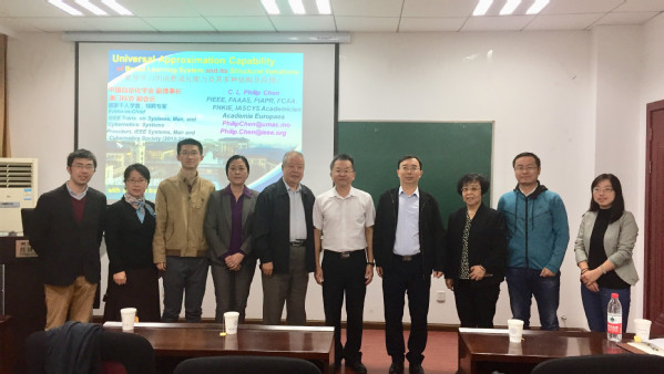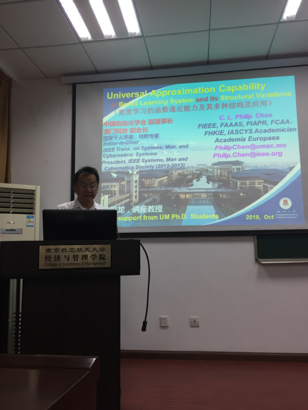 2018年10月23号上午,澳门大学陈俊龙教授受我院智能决策与风险分析研究所邀请,在经管院704室做了题为“宽度学习的函数逼近能力及其多种结构及应用”的精彩讲座。经济与管理学院刘思峰教授、徐海燕教授、朱建军教授、自动化学院院长姜斌教授、加拿大纽芬兰纪念大学商学院Ginger Y. Ke副教授及其他教师代表、硕博研究生现场认真听取了陈俊龙教授的报告,本次学术报告由徐海燕教授主持。
