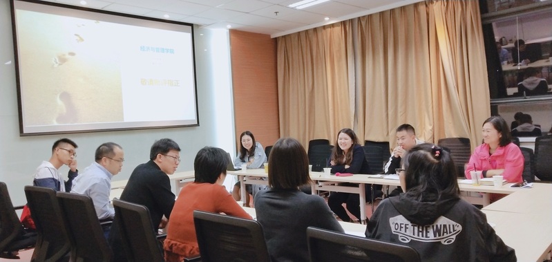 广东医科大学药学院此次走访调研主要以交流学生党员发展中心建设和创新创业教育为主题。首先,袁颖对经管学院党员发展研究中心的创立背景、发展过程、工作成果等方面进行了详细介绍,丁书记说:“党员的培养教育工作至关重要,通过和经管学院的交流,使我们对如何将党建与专业特色、实习实践相结合等问题有了更多感悟和思考。”随后,辅导员许乃元、胡心雨向来访嘉宾介绍了学院在搭建创新创业教育平台、举办各类专业赛事、组织专业实习实践活动等方面的经验举措。在交流中,涂书记就对方特别关注的问题进行了耐心细致的解答,就学生党员发展研究中心的运行和管理问题、如何调动学生参与创新创业的积极性等内容,双方充分交流,互为启发,在认真愉快的氛围中结束了交流调研活动。