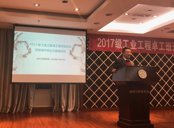11月12日,2017级工业工程卓越工程师班开班典礼暨首届IE班主任论坛在经济与管理学院A0305报告厅圆满举行,经济与管理学院院长周德群、灰色系统研究所所长刘思峰、校教务处副处长朱建军、学院副院长邓晶、学院党委副书记涂志宏、管工系副主任虞先玉、17级卓工班班主任关叶青和十余位青年教师、各年级辅导员、全体卓工班学生参加了本次论坛。