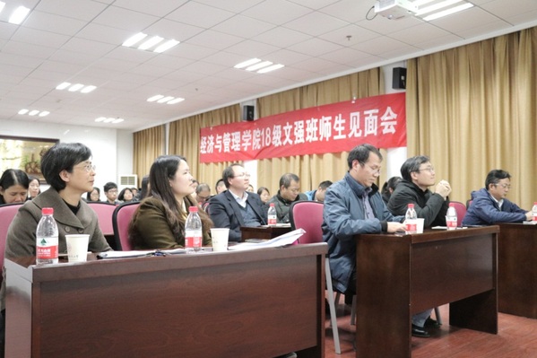 11月28日下午,经济与管理学院召开教育思想大讨论——18级文科基础强化班师生见面会。学院院长周德群,副院长邓晶、王英、王子龙,党委副书记涂志宏及文强班的班主任、近20位导师等参加了本次活动。