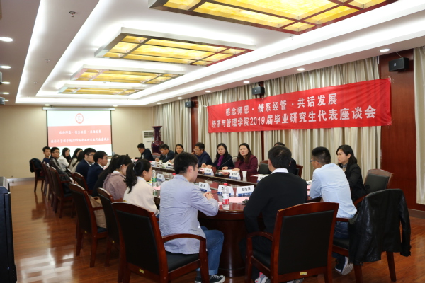 4月4日下午1点,经济与管理学院在学院604会议室举办“感念师恩•情系经管•共话发展”2019届毕业研究生代表座谈会。经济与管理学院院长周德群、党委书记焦宏图、副院长王英、党委副书记涂志宏、各系系主任、副主任、毕业生辅导员以及钱梦烨等15名应届硕士毕业生出席了本次座谈会。