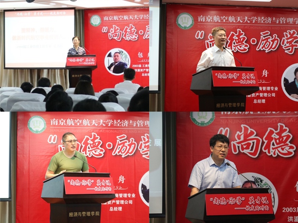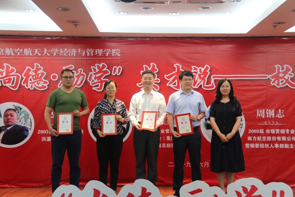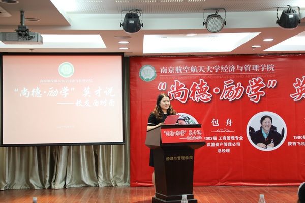 6月1日下午,经济与管理学院“尚德•励学”英才说——校友面对面活动在学院 A0305 报告厅举行。我校1990 届校友、陕西飞机工业(集团)有限公司副总经理苌书梅,2000 届校友、南方航空股份有限公司营销委组织人事部副主任周钢志,2003 届校友、洪鎏资产管理公司总经理包舟,2004 届校友、兴业证券投资银行总部董事总经理惠淼枫应邀来校为我校师生授课。