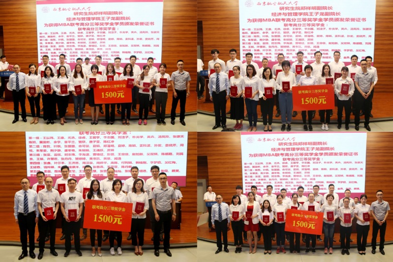 南京航空航天大学研究生院副院长郑祥明宣读获得2019级MBA奖学金名单,本次奖学金项目设置联考排名奖学金和联考高分奖学金。郑祥明、周德群、焦宏图、王子龙等分别为获奖同学颁奖。