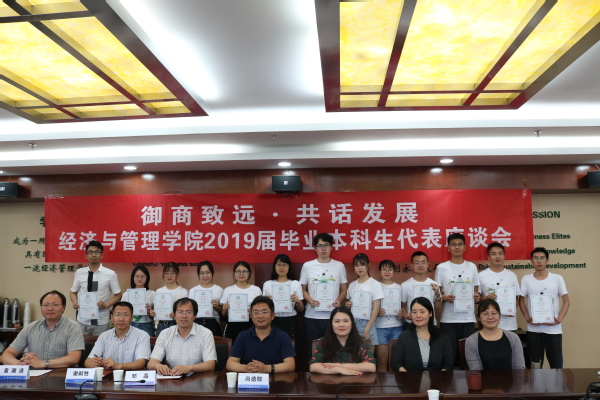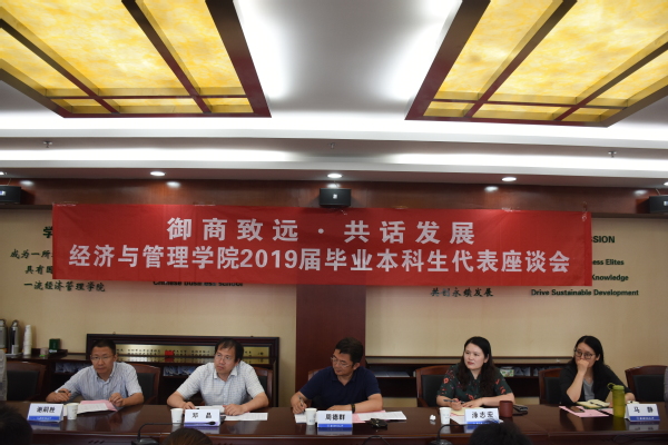 6月12 日下午,经管学院“御商致远 • 共话发展”2019届本科毕业生座谈会在经管楼604会议室举行。经济与管理学院院长周德群,副院长邓晶,党委副书记涂志宏,各系系主任,辅导员以及毕业生代表们参加了此次活动。