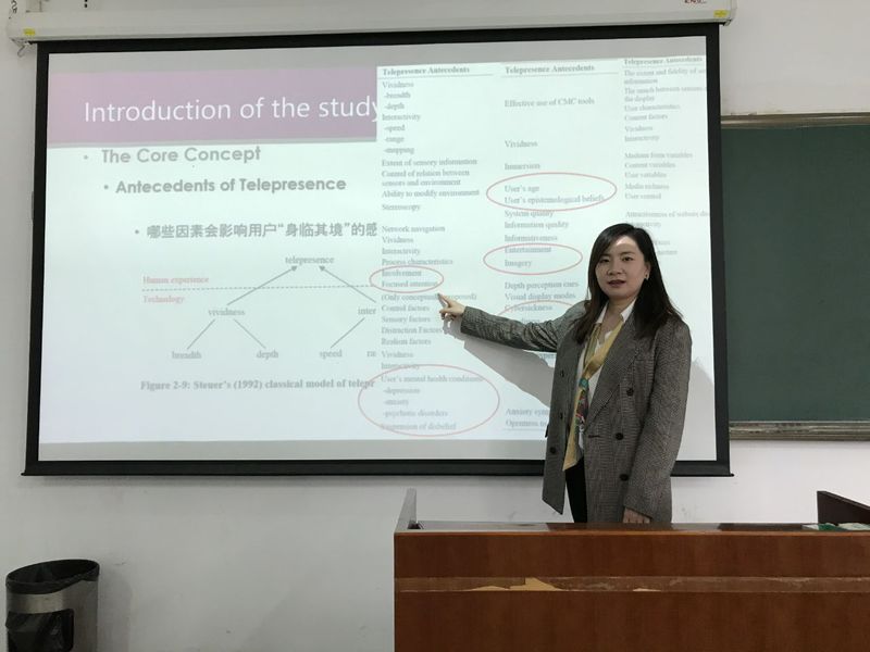 10月14日上午,南开大学商学院信息资源管理系讲师张丹老师应经济与管理学院信息管理与电子商务研究所邀请,在经济与管理学院704会议室作了题为“虚拟环境中用户‘身临其境’感觉的探索性研究”的精彩学术报告。报告由讲师肖琳主持,副教授宋连莲、讲师刘文龙等老师及部分硕士、博士研究生参加了本次学术讲座。