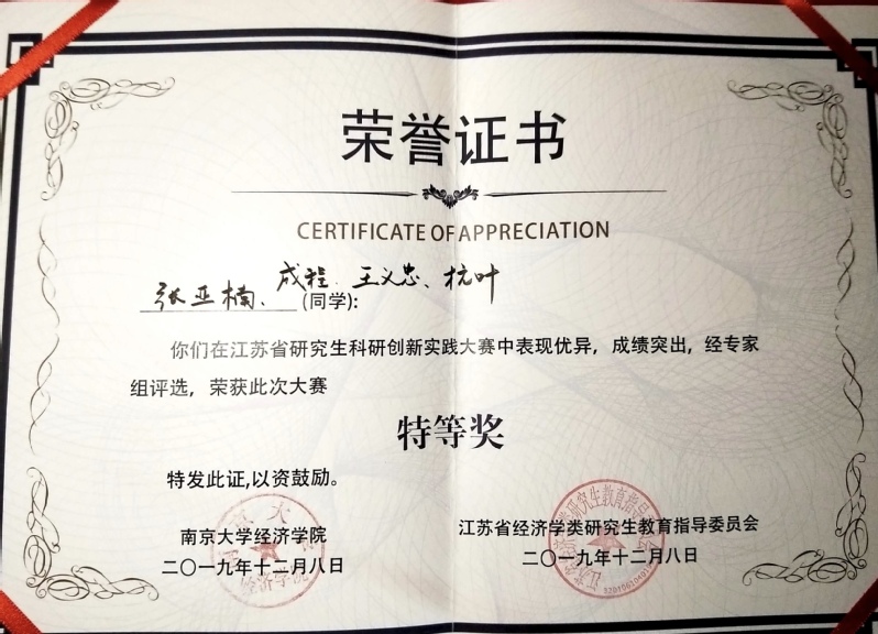 12月8日,江苏省研究生科研创新实践大赛决赛在南京大学顺利进行,共有来自19所全国高校的22支队伍参加汇报,经济与管理学院研究生张亚楠、成程、王义忠、杭叶组成的Wgroup(团队名)打败了诸多强手,荣膺特等奖,获得奖金10000元。
