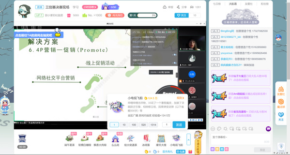 初赛通过函评加3分钟答辩的形式成功选出16支队伍晋级决赛。决赛采用腾讯会议平台进行团队答辩展示展示和评委互动,并在哔哩哔哩平台进行全程直播,直播全程设有多轮互动抽奖环节。我校老师和同学们在线上“云学习、云研讨、云进步”,热情空前高涨,抽奖等热点时刻人气值达到约1270人。很多兄弟院校教师也线上欣赏了大赛风采,并对大赛的开展给予了中心的祝福。同时,基于大赛的充分宣传,大赛人气投票累计曝光度突破10000人次,公众号累计浏览量达2000+,个人公众号推广浏览量5000+,大赛对南航、经管院以及赞助企业的宣传效果优秀。