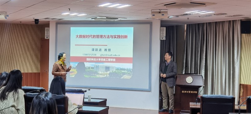11月25日下午,国防科技大学教授谭跃进受学院智能决策与风险分析研究所邀请,在南航将军路校区经管辅楼A0405作了题为“大数据时代的管理方法与实践创新”的讲座。我院教授徐海燕等教师及部分硕、博研究生现场聆听了谭跃进的报告分享,本次学术报告由徐海燕主持。