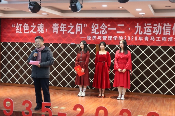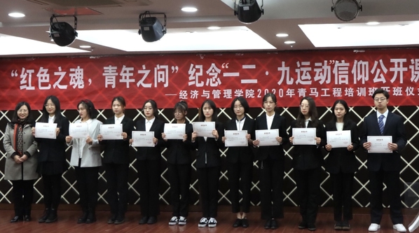 12月9日晚,经济与管理学院“红色之魂,青年之问”纪念“一二•九运动”信仰公开课暨2020年青马工程培训班开班仪式于经管楼A0305成功举办。经济与管理学院党委书记焦宏图,党委副书记涂志宏,经济系教授江可申,经管“红石榴”工作坊指导老师、学生处教师玛依拉•赛依力,团委书记刘小杨,以及各年级辅导员和二百余位学员出席了本次活动。