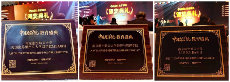 值此中国商科教育发展30周年之际,为表彰和激励优秀商科项目、团队和个人,现场颁发了几类奖项,200多所商学院院长、老师共同见证这一荣耀时刻。南京航空航天大学MBA项目荣获“最佳MBA项目TOP100”第36名,南京航空航天大学与密苏里州立大学合作的MBA项目荣获“最佳中外合作硕士项目TOP30”第14名,南京航空航天大学3A领航MBA项目荣获“最具特色MBA项目”,南京航空航天大学经济与管理学院副院长王子龙获得“中国商学院卓越运营奖”。