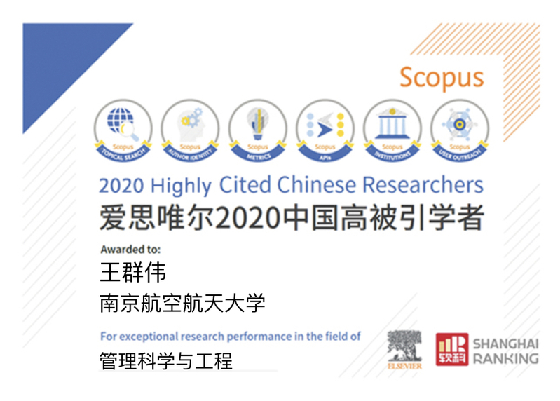 南京航空航天大学共有10个一级学科的31位学者入围。王群伟教授入选管理科学与工程学科中国高被引学者,这是继入选2020科睿唯安(Clarivate Analytics)全球高被引科学家(Highly Cited Researchers)后再次入选重要学术榜单。