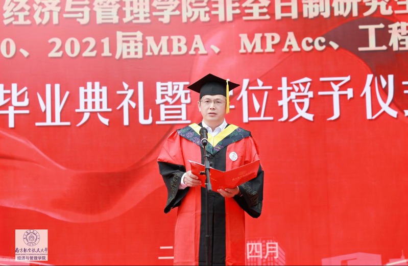 4月24日下午,南京航空航天大学经济与管理学院MBA、MPAcc、工程硕士毕业典礼暨学位授予仪式在经济与管理学院广场隆重举行。校党委研究生工作部部长张启钱,学院党委书记苏州、副院长王子龙、邓晶,教师代表刘益平、米传民、查冬兰,教育培训中心全体老师出席本次典礼,毕业典礼由执行主任杜刚主持。