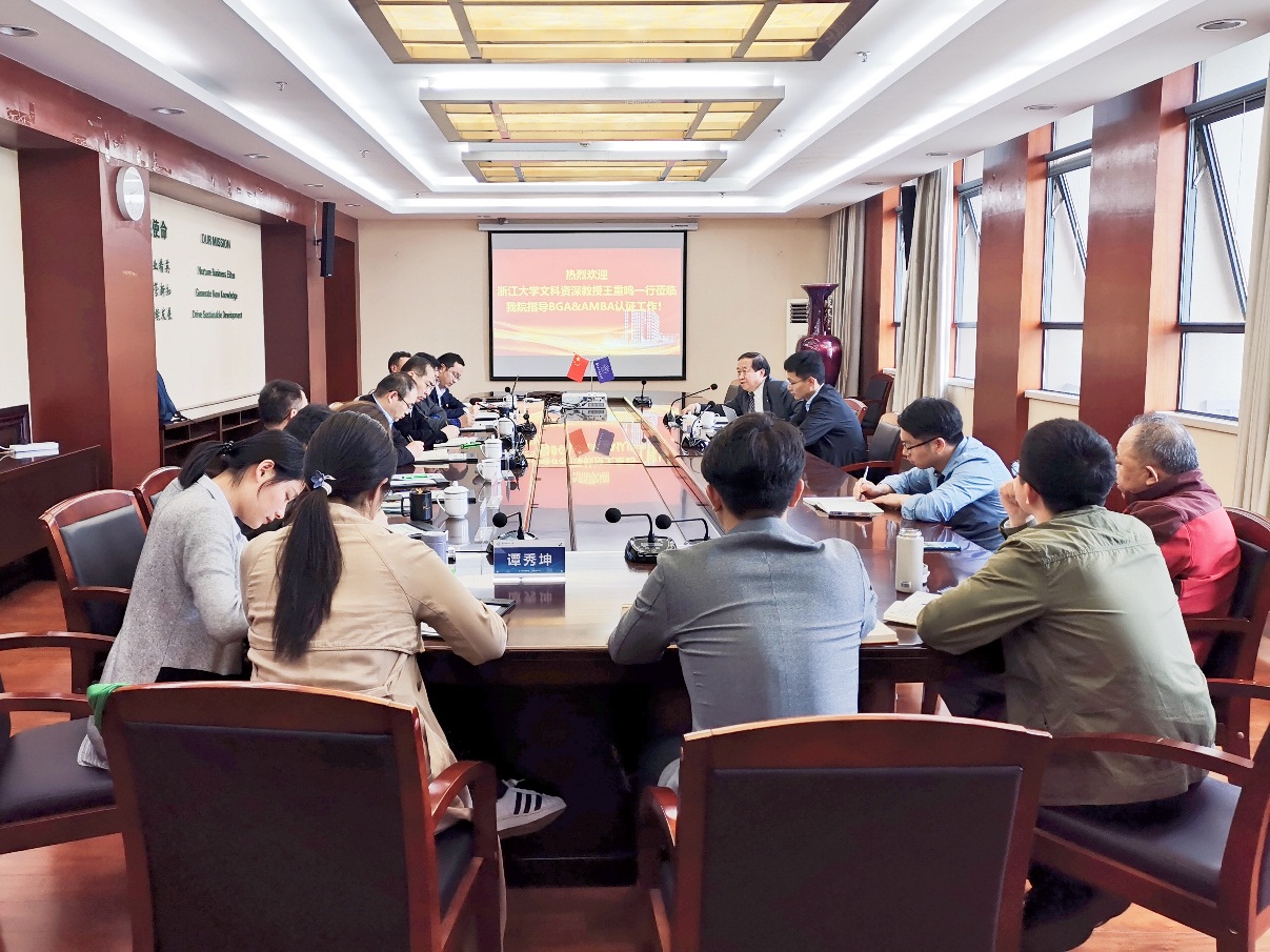 4月28日下午,经济与管理学院在经管楼604会议室举行BGA国际认证研讨会。浙江大学文科资深教授、浙江省特级专家、浙江大学管理学院博士生导师、国际丝路创业教育联盟理事长、AMBA&BGA国际认证协会中国顾问与中国区总协调人王重鸣教授莅临指导BGA国际认证相关工作,教务处副处长朱建军、经济与管理学院院长周德群、党委书记苏州、学院副院长王子龙、院长助理兼认证办公室主任谢嗣胜、教学办主任田苑娜、MBA教育中心执行主任杜刚以及相关人员参加会议。