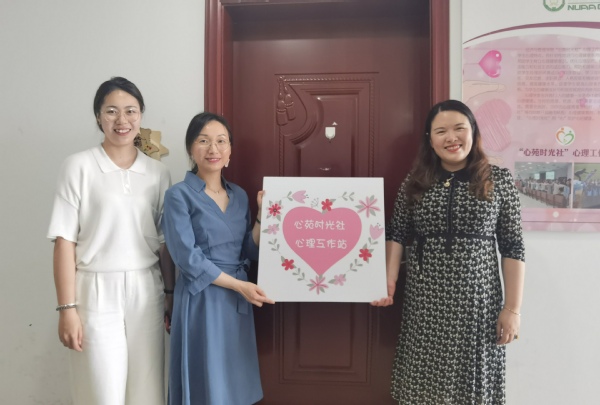 最后,胡心雨带领大家参观了“心苑时光社”心理工作站,经管学院划拨506办公室作为心理健康室,为心理健康教育提供场地支持,开设“心灵图书&解压角”,摆放有关心理减压、人际交往、导学关系等方面的心理书籍和减压工具,旨在为学生创造一个舒缓心情的绝佳场所。涂志宏、陈瑜共同为心理工作站以及心灵解压角挂牌。