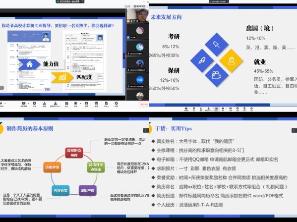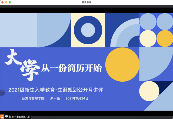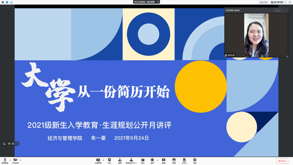 为了帮助2021级新生更好地了解学校、了解专业,为今后的学习和生活打下良好基础,9月24日,经济与管理学院2021级本科生辅导员朱一豪以“大学,从简历开始”为主题线上开展了公开月讲评活动,院党委副书记涂志宏、团委书记刘小杨及全体2021级本科生参加了本次活动。