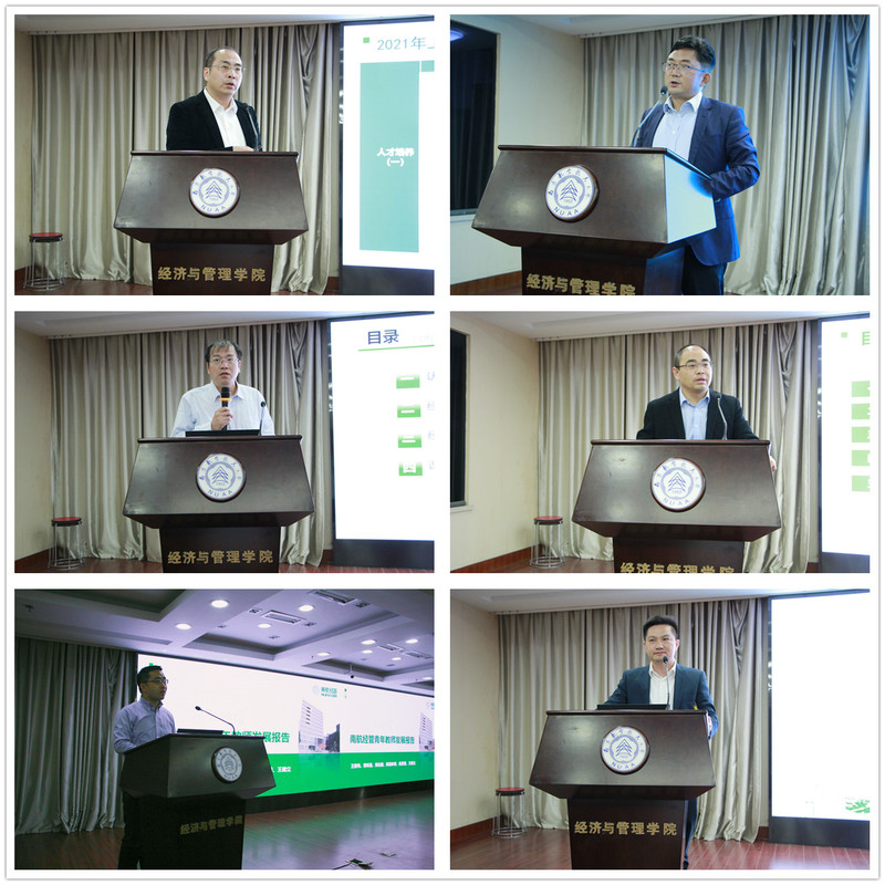 随后,院领导班子成员围绕各自分管的重点工作作专题报告:王群伟报告了青年教师发展计划;邓晶提出了学院新文科建设方案;谢乃明提出高质量研究生教育教学行动计划;王子龙作了MBA教育中心办学水平提升方案报告。