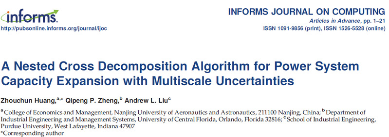 近日,南京航空航天大学经济与管理学院青年教师黄周春作为第一作者在UTD24国际顶级期刊《INFORMS Journal on Computing》上在线发表了题为《A Nested Cross Decomposition Algorithm for Power System Capacity Expansion with Multiscale Uncertainties》的学术论文。该论文由我院教师黄周春、美国中佛罗里达大学工业工程系Qipeng Phil Zheng副教授、美国普渡大学工业工程系Andrew Liu副教授合作完成。
