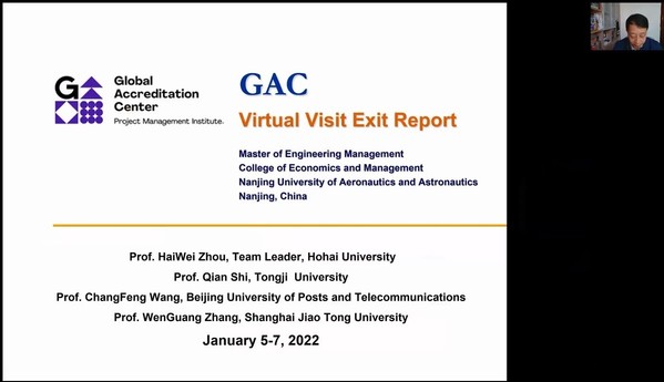 2022年1月5日-7日在经管学院举行了为期三天的现场考察评估(云端会议),现场考察评估组由河海大学周海炜教授担任组长,组员包括同济大学施骞教授、北京邮电大学王长峰教授以及上海交通大学张文光副教授。我校研究生院、经管学院的相关领导、教师及教学管理人员参加了现场考察与评估活动,党委书记苏州研究员主持仪式,研究生院副院长王英教授代表学校致欢迎辞,周德群院长介绍了学校和学院的总体情况,王子龙副院长对MEM专业硕士学位项目培养体系作了总体陈述,院长助理周志鹏就认证的具体问题向专家进行了详细汇报,相关领导与教师针对专家关心的问题一一作了回答。在为期三天的考察评估中,专家组通过云端会议翻阅查看了课程教学大纲、毕业论文、试卷及学生作业等项目资料,从多维度考察MEM专业硕士学位项目的核心教学内容与教学效果,通过在线方式与教师代表、学生代表、校友代表、教学管理人员代表以及用人单位代表分别进行了深入访谈,从多视角系统了解MEM专业硕士学位项目教育教学情况、办学特色和学员、雇主满意度。在现场考察评估意见反馈阶段,专家组对我院MEM专业硕士学位项目的培养体系、教学管理模式和培养质量给予了高度评价,并一致推荐南航MEM专业硕士学位项目通过PMI-GAC认证。针对反馈意见,周德群院长、苏州书记分别做了表态发言,对考察评估专家组严谨细致的工作和提出的中肯意见表示衷心感谢,并表示将以此次认证为契机,进一步提升MEM专业硕士学位项目办学质量,为我国工程管理实践和航空航天领域的高端技术管理人才培养做出更大贡献。