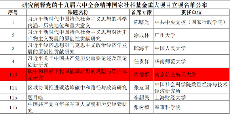 4月8日,全国哲学社会科学工作办公室公布了研究阐释党的十九届六中全会精神国家社科基金重大项目立项名单,我院周德群教授担任首席专家的项目《碳中和目标下我国能源转型风险与管控体系研究》获批立项。此次全国共立项130个项目,分布在85个责任单位,其中高校69所。