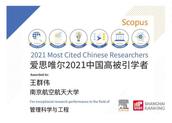 2022年4月14日,爱思唯尔(Elsevier)正式发布了2021年度“中国高被引学者”(Highly Cited Chinese Researchers)榜单。南京航空航天大学经济与管理学院王群伟教授入选管理科学与工程学科中国高被引学者。