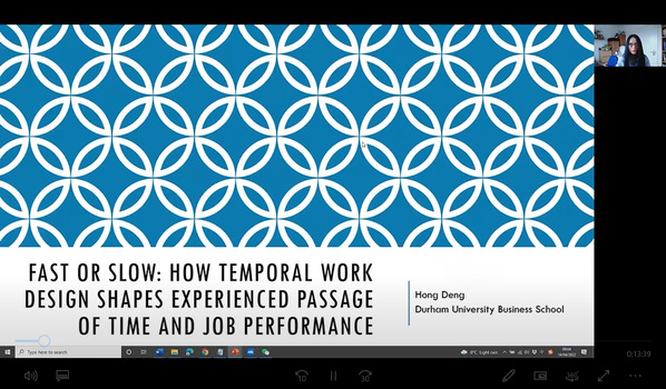 4月14日,英国杜伦大学教授邓红应经济与管理学院人力资源管理研究所和江苏省人力资源发展研究基地的邀请,在线上为我院师生作了题为“Fast or Slow: How Temporal Work Design Shapes Experienced Passage of Time and Job Performance”的精彩学术报告。本次报告由教授胡恩华主持,相关教师、博士生和硕士生参加了此次学术报告活动。