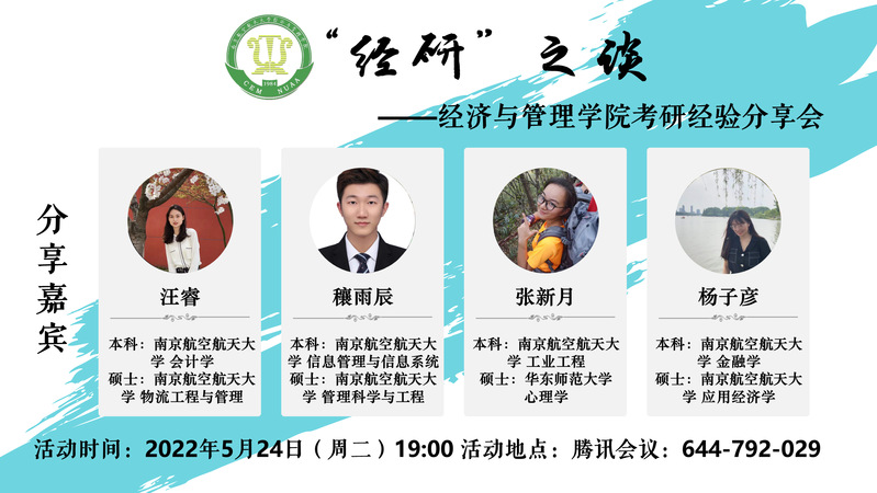 为引导学生理性考研,加强考研指导,5月24日晚,经济与管理学院开展经“研”之谈——2019级考研经验分享会,2019级本科辅导员胡心雨,往届优秀考研学生代表汪睿、穰雨辰、张新月、杨子彦以及备战考研的同学们参加此次活动。