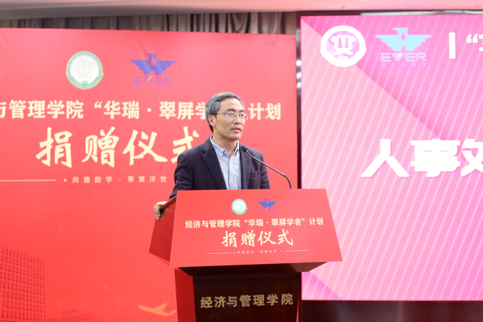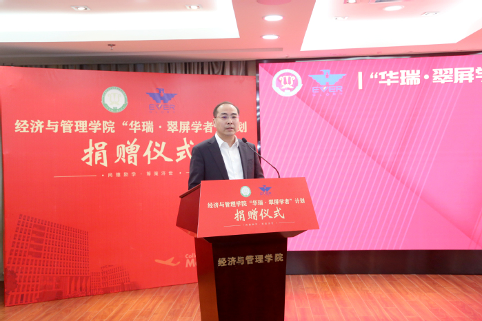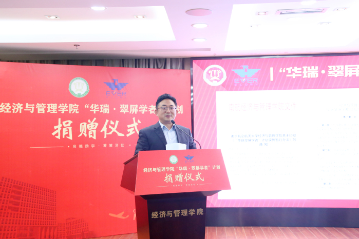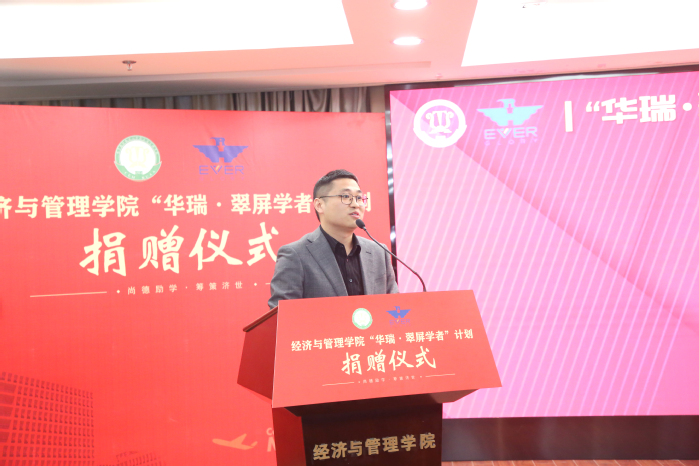 为进一步加大高层次人才引培力度,由江苏华瑞时尚集团资助支持,经济与管理学院启动实施“翠屏学者”计划。2022年11月4日下午,“华瑞•翠屏学者”计划捐赠仪式在经管学院A0305报告厅举行。江苏华瑞时尚集团创始人康宜华校友,华瑞集团财务部、人力资源部相关负责人,校党委副书记、纪委书记杭育新,人事处处长/高级人才办主任崔海涛,学院领导班子成员,院长助理,各系系务委员会成员,各研究所所长,入选校“长空学者”计划人才,校首批百强团队成员,青年教师代表以及博士生代表参加仪式。捐赠仪式由学院党委书记苏州主持。