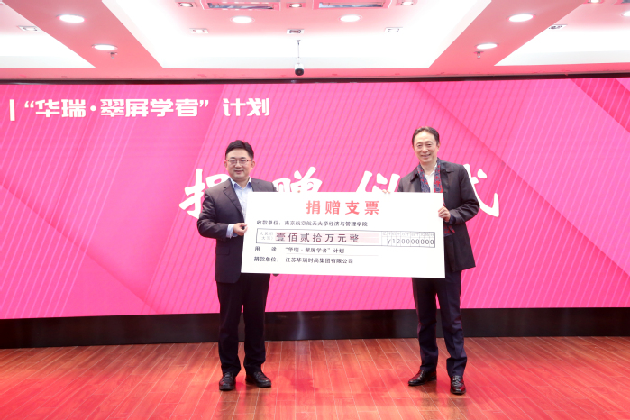 随后进行捐赠仪式,周德群代表学院接受康宜华院友的捐赠,苏州向康宜华院友颁发捐赠证书。江苏华瑞时尚集团向学院捐款壹佰贰拾万元整,专项用于“华瑞•翠屏学者”计划。