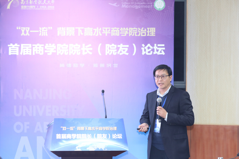 2022年11月19日,南京航空航天大学经济与管理学院首届商学院院长(院友)论坛在学院A0405报告厅举行。本次论坛采用线上与线下相结合的形式,围绕“‘双一流’背景下高水平商学院治理”主题,聚焦探讨商学院治理理念,共谋商学院未来发展。南京航空航天大学校长、中国工程院院士单忠德,经济与管理学院党委书记苏州、院长周德群,中国石油大学(华东)党委常委、副校长周鹏,南京艺术学院党委常委、副院长张捷,宿迁学院党委常委、副院长侍旭以及来自国内四十余所高校的院友商学院院长、专家学者参加本次论坛。论坛由经济与管理学院党委副书记胡苹主持。